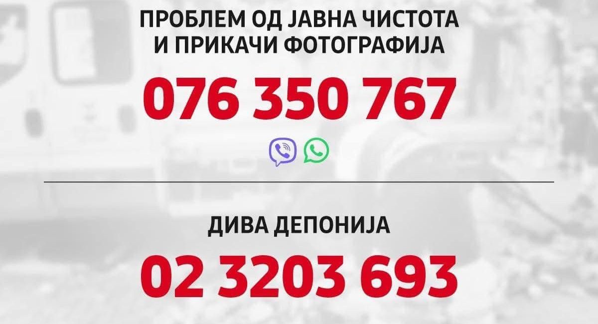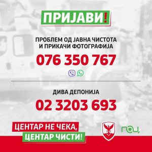 Општина Центар ги повикува граѓаните да пријават проблеми со јавната чистота на територија на општината со цел брза интервенција на службите. Граѓаните можат да пријават смет и диви депонии на следните телефонски броеви: 076/350-767 и 02/3203-693.
