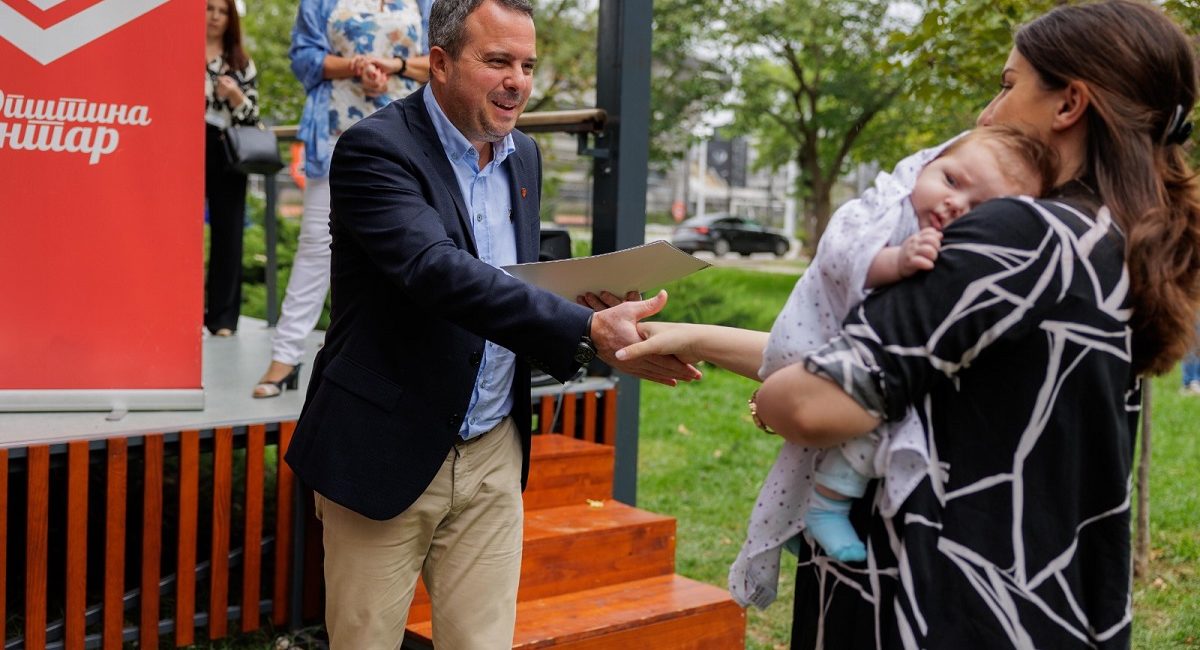 „На мое задоволство денеска овде во Паркот на Франкофонијата ги доделуваме решенијата за еднократна парична помош за најмладите Центарци. Покрај овие средства, новите родители добиваат и пакет производи и услуги од општествено одговорните компании Еурофарм, ПЗУ Жан Митрев, Реплек, Геопром, Хип, Веледа за што би сакал да им упатам искрена благодарност. Со подарувањето педијатриски услуги и сет производи општествено одговорните компании покажуваат дека се силно фокусирани на своите потрошувачи. Тоа е навистина за поздрав“, истакна Герасимовски.