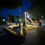 Станува збор за футуристичка конструкција со неправилни облици, клупи, декоративно зеленило и паркинг за велосипеди која е донација од Стопанска банка АД – Скопје.
