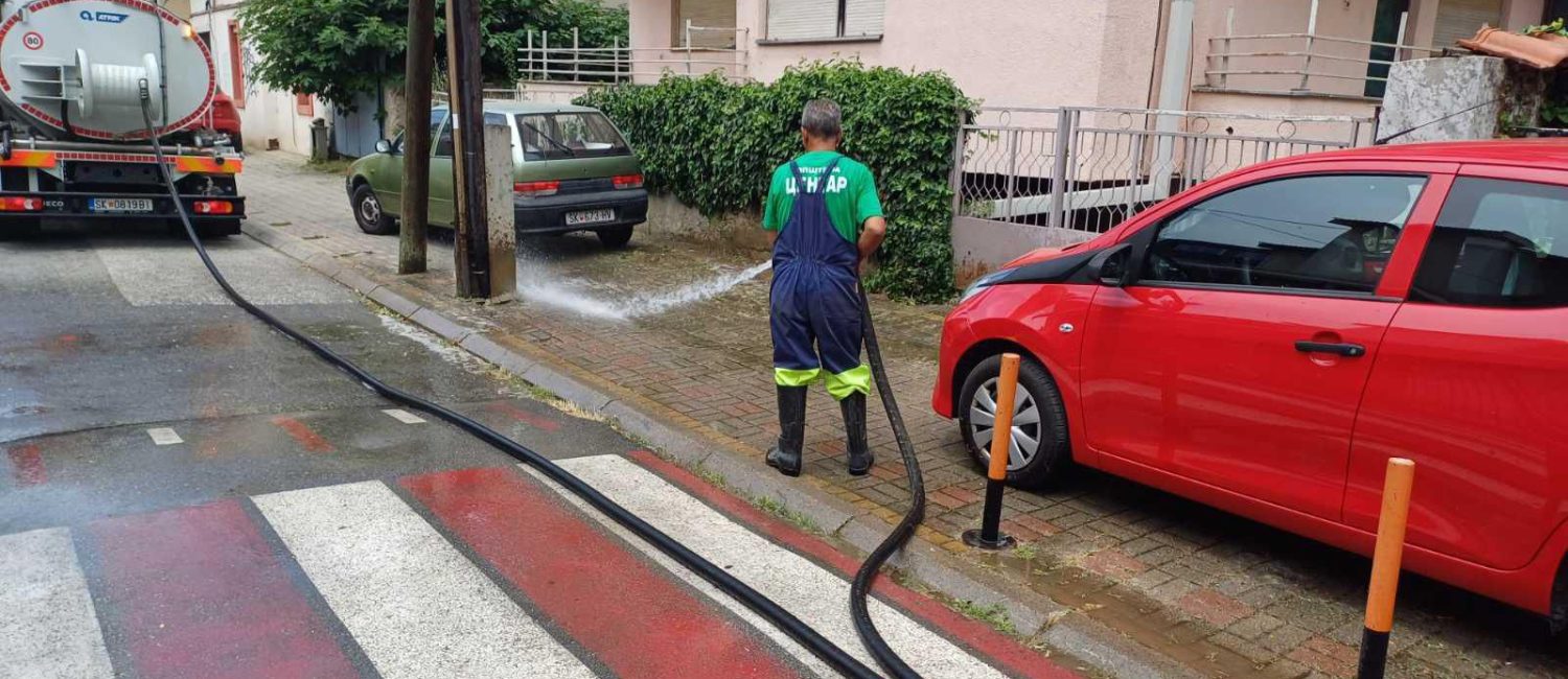 Продолжуваме со одржување на зеленилото и јавната хигиена преку миење улиците, отстранување на прашината и освежување на просторот од жешките температури.